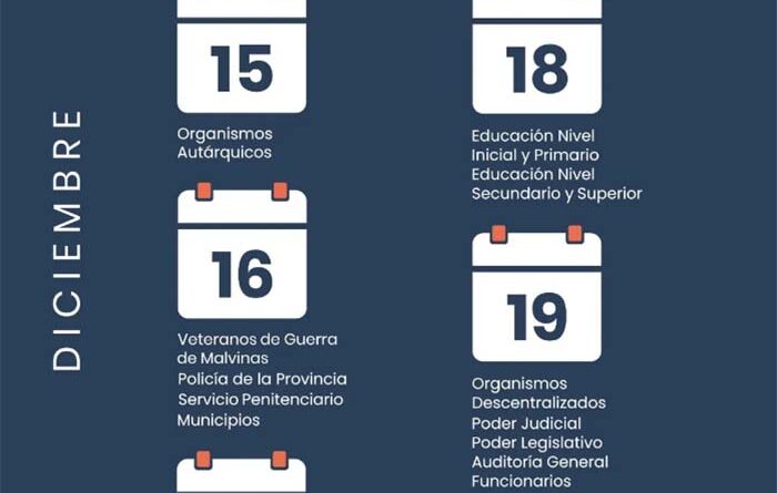 El jueves 18 será el turno de Educación Nivel Inicial y Primario; Educación Nivel Secundario y Superior. Finalmente, el viernes 19, Organismos Descentralizados, Poder Judicial, Poder Legislativo, Auditoria General y funcionarios.