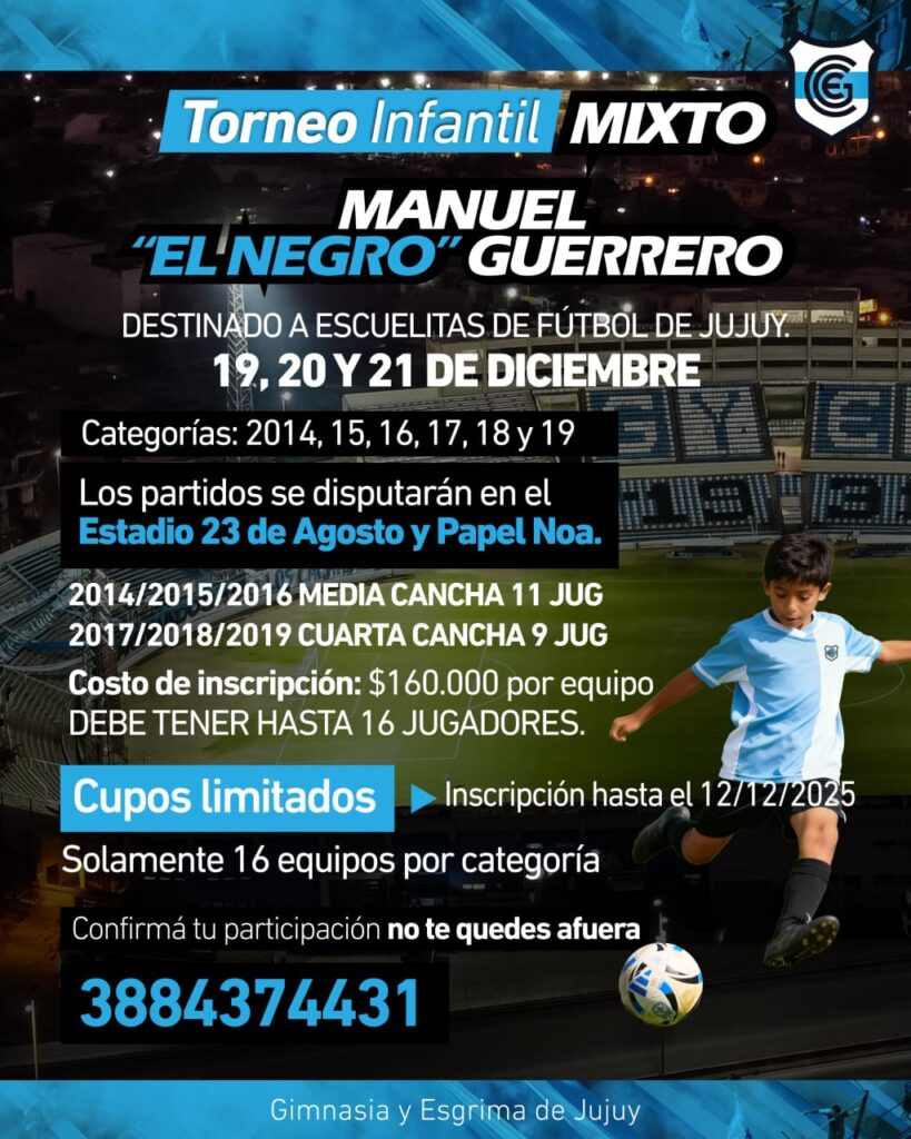 Este viernes, 12 de diciembre, finaliza el período de inscripción para participar del torneo de fútbol infantil “Manuel ´El Negro´ Guerrero”, organizado por el Club Gimnasia y Esgrima de Jujuy. Quedan pocos cupos para los equipos interesados en competir.